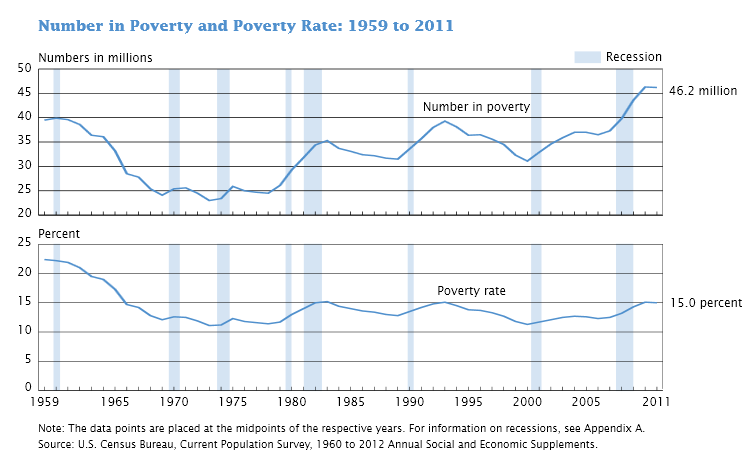 نمودار زیر هم که از دانشنامه ویکی پدیا گرفته شده است نشان دهنده درصد فقر و میزان فقر در کشور آمریکاست. اگر چه نسبت به چند دهه گذشته این کشور توانسته است نرخ فقر خود را در زیر 15 درصد نگه دارد، اما با این وجود در سال 2010 به بیشترین میزان فقیر در پنجاه سال گذشته رسید تا جایی که بالغ بر 46 میلیون فقیر در این کشور زندگی می کنند.